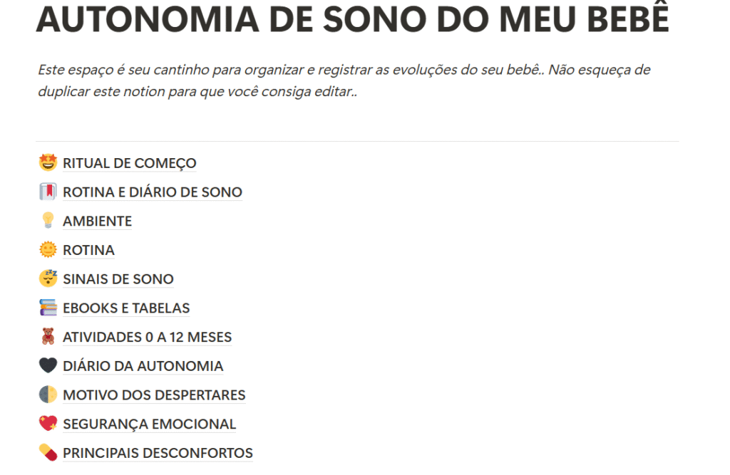 Você vai ter esse guia de bolso. Seu SOS do Sono organizado em um Notion com tabelas, ebooks, checklist, diários, manuais, passo a passo…