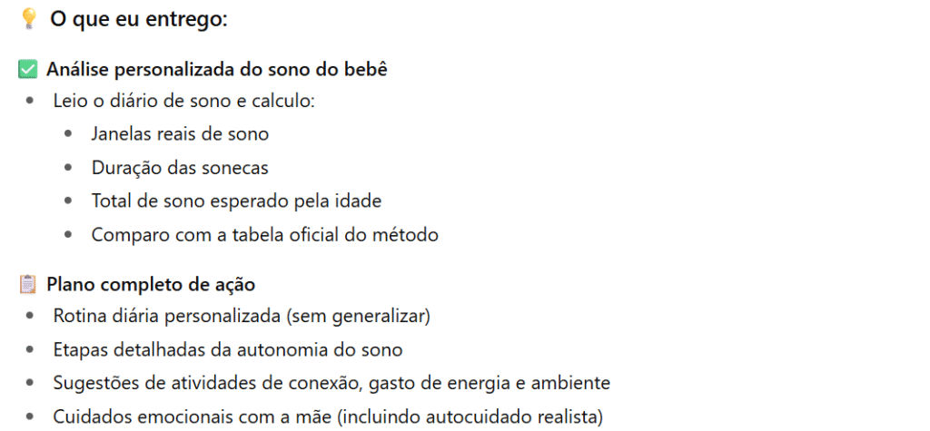 Está sem tempo de ver o curso completo e precisa de ajuda mais rápida e próxima? Passei meses treinando meu robô para te ajudar. Ele conhece todo o método, os fundamentos, a neurociência por trás do sono. Vai te ajudar.